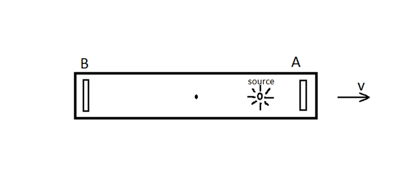 1) The source of light is put near the front end A so as to make the light signals reach A & B at the same time relative to a ground observer