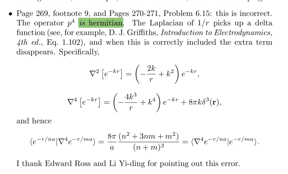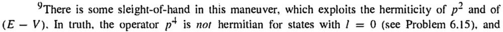 - Others argue that the context provided in the textbook suggests an error in the specific case of ##l=0##, where ##p^4## is not Hermitian.