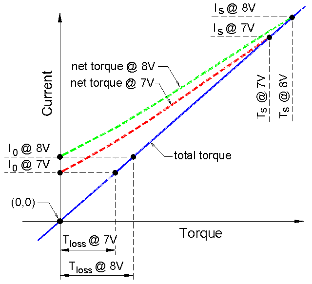 The solid blue line represents current as a function of total torque. Point A shows torque absorbed by bearing friction, commutator friction, and windage. Moving a copy of Point A horizontally to Point B gives a plot of current as a function of net usable torque.