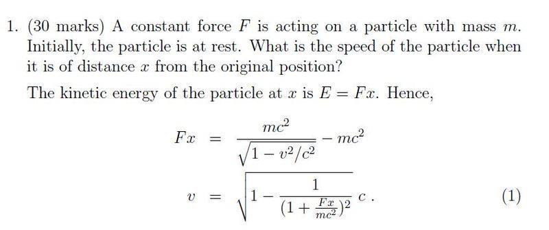 v=\frac{\sqrt{2c^2mFx-Fx}}{mc}