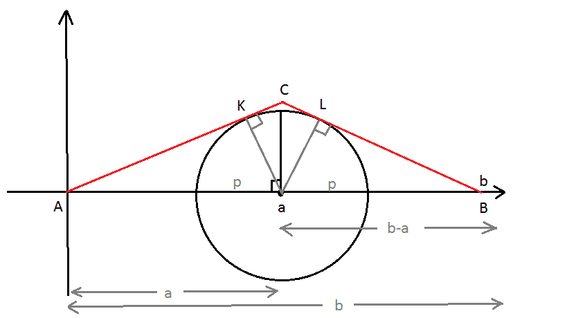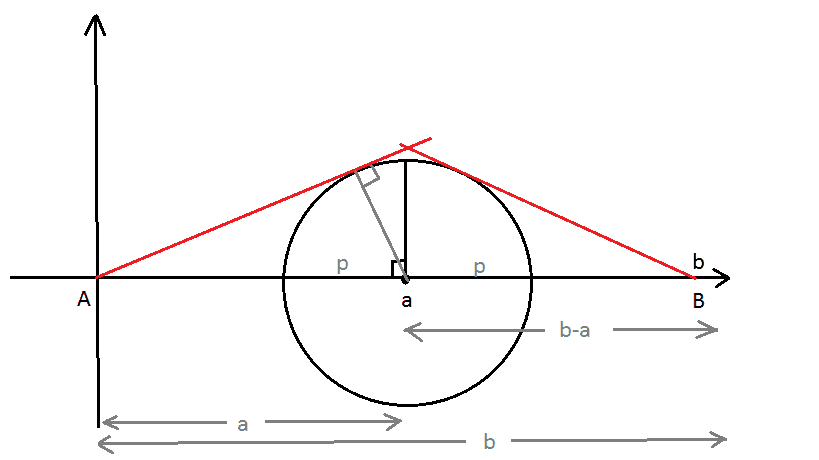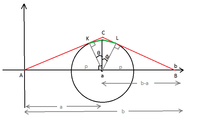 To find the the lengh ofthe first red line we apply the pythagorean theorem, right? So let $x$ be this part, then $a^2=x^2+p^2 \Rightarrow x=\sqrt{a^2-p^2}$. The last part of the red line is equal to $b-a$. How can we find the length of the red part of the circle? 3.