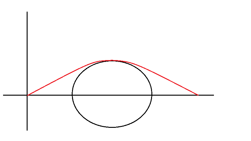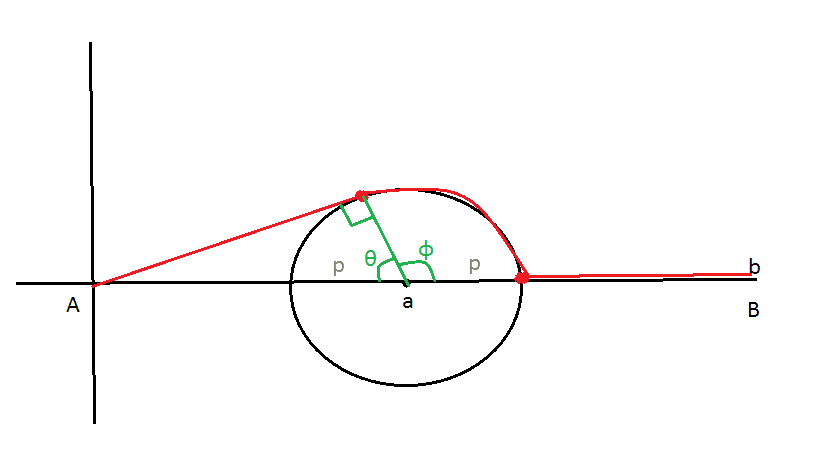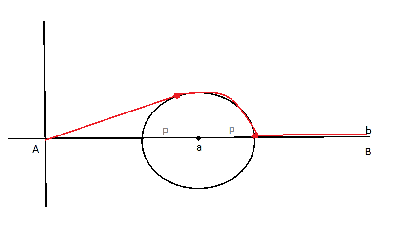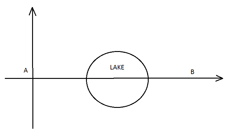 We want to get from the poit $A$ to the point $B$ avoiding the lake. How should we move to minimize the distance?