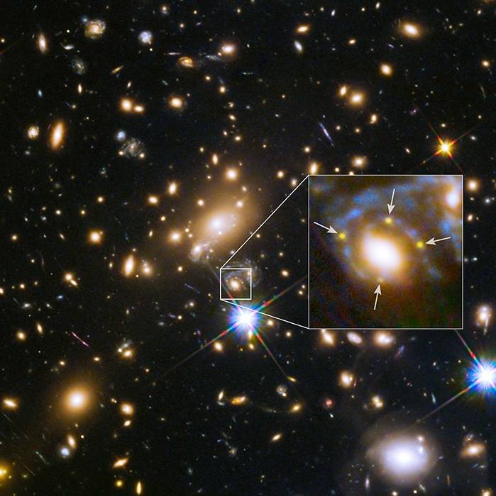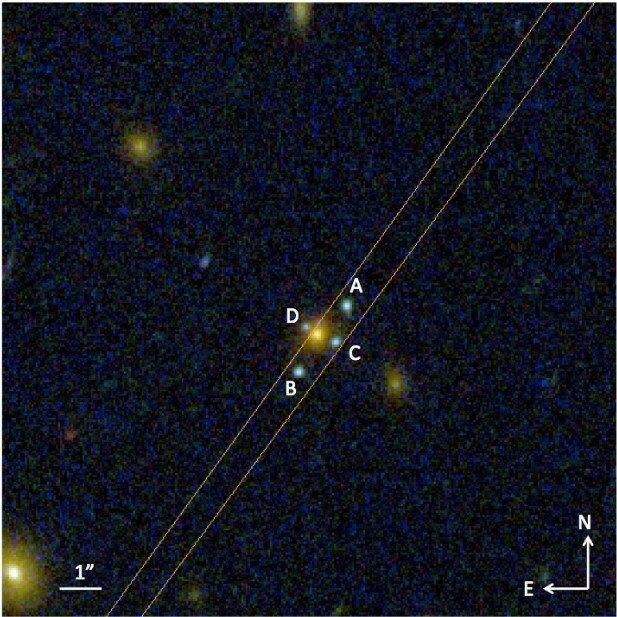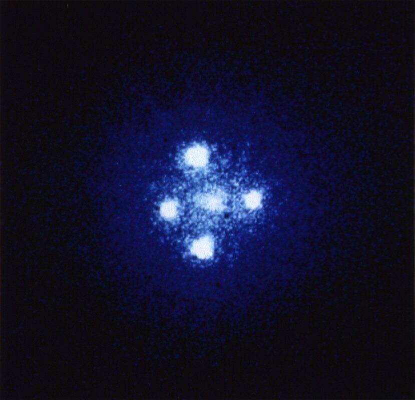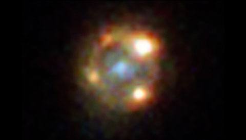 This is probably just a coincidence, but I happened to notice while looking at Einstein crosses an unusual pattern common to these four images. I was looking for more but it turns out there may not be as many crosses as I originally thought. Must be rare. The pattern is that of the 4 background objects (quasar, supernova) the line connecting two of them cross the center, while the line connecting the other two are offset from the center. Also, I'm fascinated by the symmetry of the two pairs in the images. The first observation is likely a fluke but the symmetry is what kind of gets me. For what must be an obviously distorted lens, it's a bit strange that there would be not only symmetry of one pair, but of two pair! In other words, it would be much more likely to see a two object image around the center (not even pairs, but just in two random locations) than to see two perfectly symmetrical pairs. Comments?