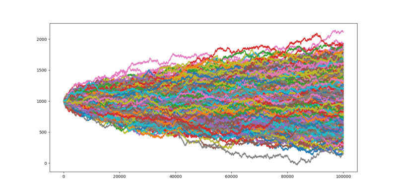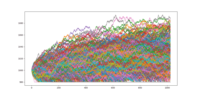 Idk if you guys are familiar with daytrading terms but in case you aren't, this is called a stop-loss, i.e. a thing that prevents you from losing more money than the level you set it at. Anyway, since this graph is clearly asymmetric, I expected more outcomes to be above 1000 than below it. This should've led to a clear profit over the long run. And yet, even when I did 100,000 flips with the stop loss, the average outcome was still around 1000. I'm at a loss as to why that happened. From a purely geometrical point of view, there should've been a net profit.