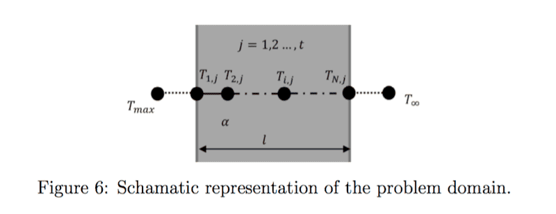It is 1D transient heat diffusion problem. x[0,L] represents a 1D spatial domain and t[0,tao] represents a time domain. T(x,t) is temperature distribution over the spatial and temporal domain. \alpha = k/(cp*rho), where k is thermal conductivity, cp heat capacity and \rho thermal conductivity.