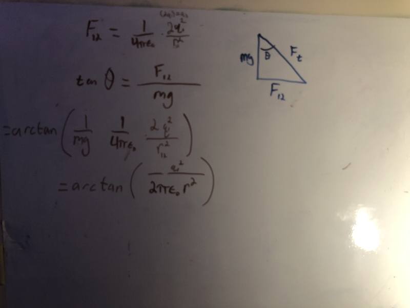 The discussion revolves around a problem in electromagnetic theory, specifically involving forces between charged masses and their equilibrium conditions. Participants are examining the correctness of a solution and the underlying equations related to forces, angles, and distances in the context of the problem.