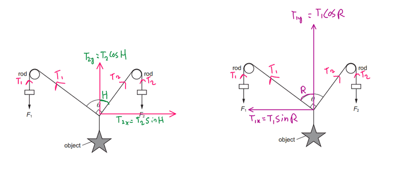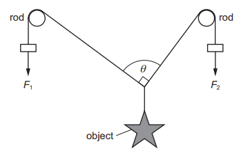 - An object hangs by means of two cords around two rods, as shown. The object is held in equilibrium by the forces F1 and F2. The object weighs 10N. There is negligible friction between the rods and cords. Angle θ is 90°. What are the values of F1 and F2?