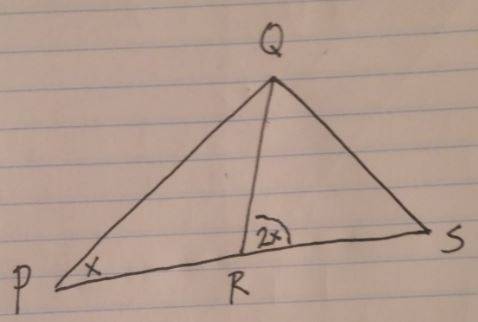 Thus angle PQR = 180 - (x) - (180 - 2x) = x. What does this tell you?