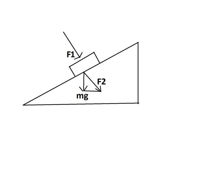 If we have brick with mass m on the inclined plane and F1 is the force that push brick down perpendicular to the surface by hand then what will the force F2 be equal to? Is ##F2## more than ##mg## (as on the picture)?