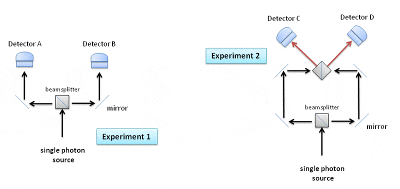 But there is a neat explanation for experiment 1. Suppose we really did have these indivisible blobs we call particles - then if the particle goes one way or the other, at random, at the beamsplitter we'd get exactly the observed behaviour. So at this point we feel fairly confident, armed with such a neat and simple explanation, that we have particles.