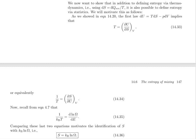 Okay, so we have that $$dU = \left( \frac{\partial U}{\partial V} \right)_S dV + \left( \frac{\partial U}{\partial S} \right)_V dS$$ And comparing that to the first law, we get that $$T=\left(\frac{\partial U}{\partial S}\right)_V$$. Comparing expressions of ##T##, $$\left(\frac{dE}{dk\ln(\Omega)}\right)=\left(\frac{\partial U}{\partial S}\right)_V$$, it ALMOST seems like ##S=k\ln(\Omega)##. But I have one doubt about the constant volume... why isn't this an issue?