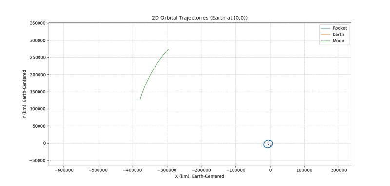 - Data: The Earth and Moon initial positions/velocities are read from CSV files (with Horizons data), and the rocket’s starting state is estimated to be in the same reference frame.