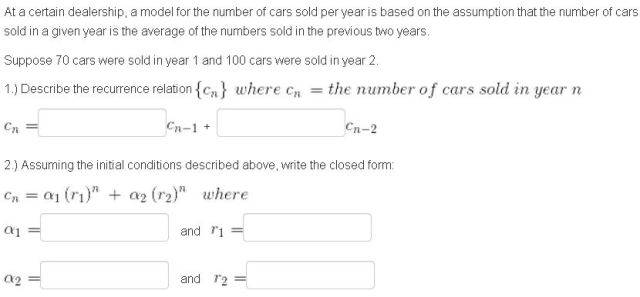 The discussion focuses on solving a linear recurrence relation where the current year's sales are the average of the previous two years' sales, expressed as $$c_{n}=\frac{c_{n-1}+c_{n-2}}{2}$$. The characteristic equation derived from the recurrence is $$2r^2-r-1=0$$, leading to roots $$r=-\frac{1}{2}$$ and $$r=1$$. The closed form of the solution is $$c_{n}=40\left(-\frac{1}{2} \right)^n+90$$, determined using initial values of sales for the first two years.