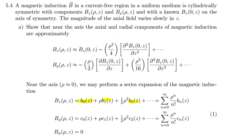 The discussion centers on solving Jackson problem 5.4, which involves magnetic induction in a current-free region. Participants explore the use of Taylor series expansion to derive the magnetic field components, specifically focusing on the terms b0, b1, and their algebraic manipulation. The solution provided utilizes the relationship b(z) = Bz(0,z) as a key element in the analysis. A hint suggests taking the divergence to further investigate the behavior of the b_n terms.
