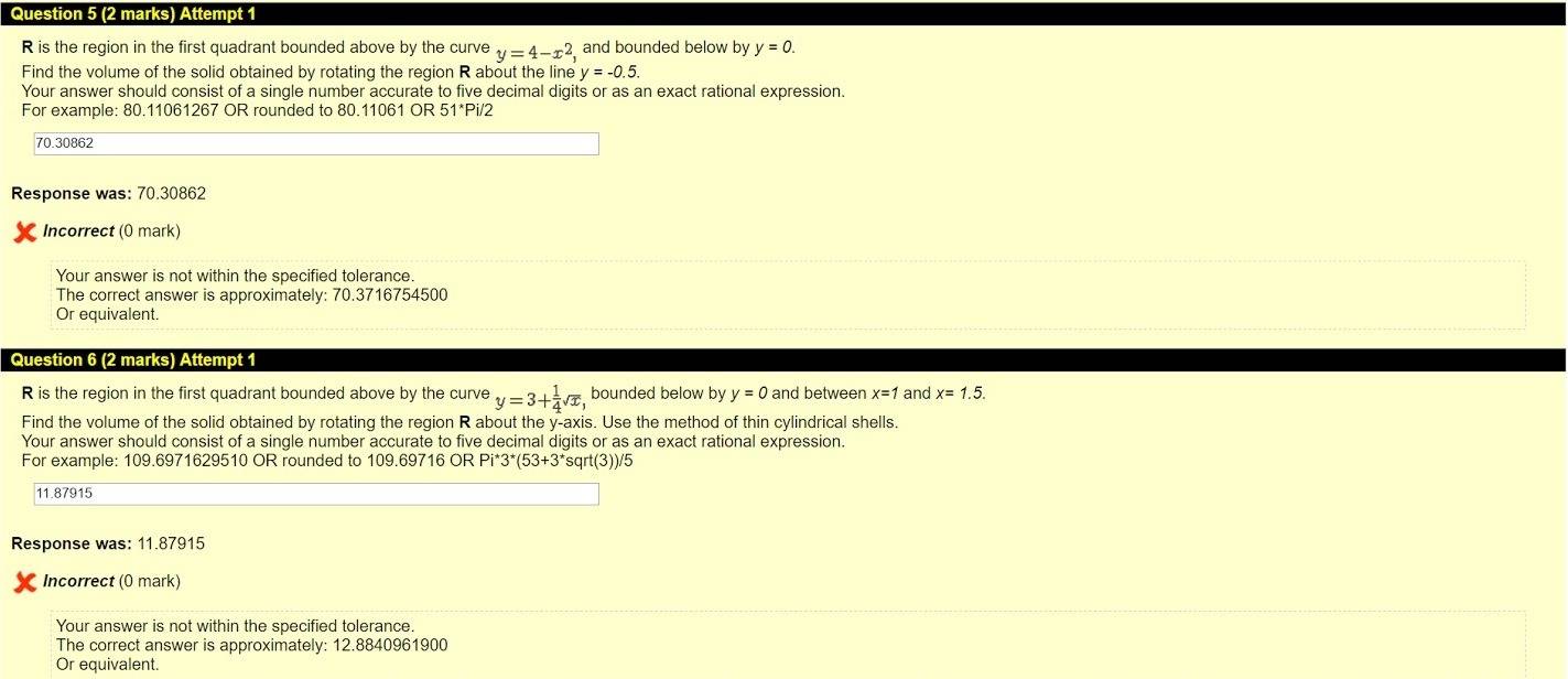 $\displaystyle \begin{align*} V &= \int_0^2{ \pi\,\left( \frac{9}{2} - x^2 \right) ^2 \,\mathrm{d}x } - \int_0^2{ \pi\,\left( \frac{1}{2} \right) ^2\,\mathrm{d}x } \\ &= \pi \int_0^2{ \left[ \left( \frac{9}{2} - x^2 \right) ^2 - \left( \frac{1}{2} \right) ^2 \right] \,\mathrm{d}x } \\ &= \pi \int_0^2{ \left( \frac{81}{4} - 9\,x^2 + x^4 - \frac{1}{4} \right) \,\mathrm{d}x } \\ &= \pi \int_0^2{ \left( 20 - 9\,x^2 + x^4 \right) \,\mathrm{d}x } \\ &= \pi \,\left[ 20\,x - 3\,x^3 + \frac{x^5}{5} \right] _0^2 \\ &= \pi \,\left[ \left( 20 \cdot 2 - 3 \cdot 2^3 + \frac{2^5}{5} \right) - \left( 20 \cdot 0 - 3 \cdot 0^3 + \frac{0^5}{5} \right) \right] \\ &= \pi \, \left( 40 - 24 + \frac{32}{5} - 0 \right) \\ &= \pi \, \left( 16 + \frac{32}{5} \right) \\ &= \frac{112\,\pi}{5}\,\textrm{units}^3 \\ &\approx 70.371\,68 \, \textrm{units}^3 \end{align*}$I will do the second question when I have a spare moment.