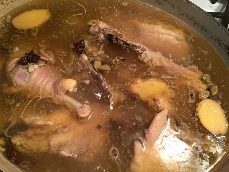 It has been simmering for 2 hours, and I'm going to let it go for another hour. If this was your ordinary supermarket chicken, it would be mush by the time I'm done.