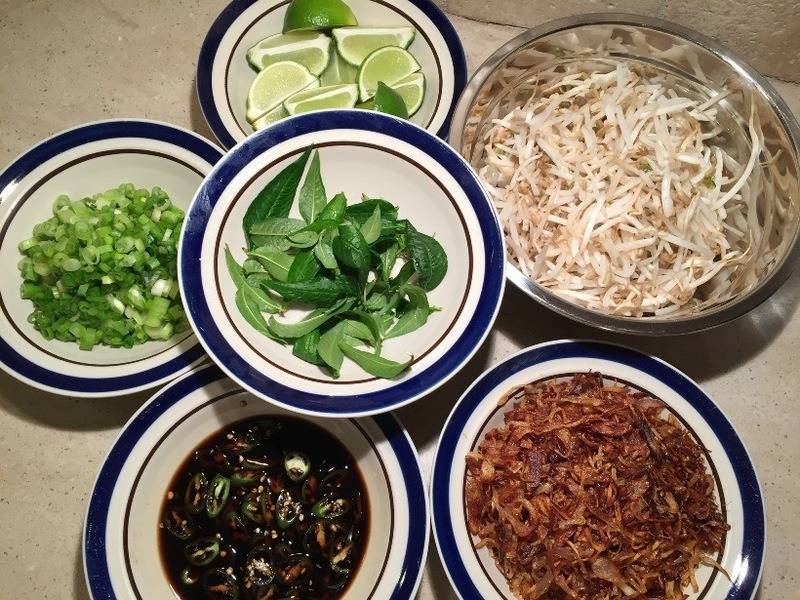 Of course, I have to make the broth myself since that is the most important component of the dish. I bought a whole hen (not a chicken), and since 9 am this morning, I've been simmering it in a huge pot to make the broth. I added 4 cinnamon sticks, 8 star anise, 2 onions, one whole head garlic, pepper corns, whole cardamoms, several thick slices of ginger, and a few bay leaves.