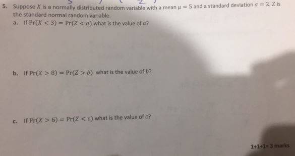 $\displaystyle \begin{align*} z &= \frac{x - \mu}{\sigma} \\ b &= \frac{8 - 5}{2} \\ b &= \frac{3}{2} \\ b &= 1.5 \end{align*}$(c) We are told $\displaystyle \begin{align*} \textrm{Pr}\,\left( X > 6 \right) = \textrm{Pr}\,\left( Z < c \right) \end{align*}$, so by symmetry, $\displaystyle \begin{align*} \textrm{Pr}\,\left( X > 6 \right) = \textrm{Pr}\,\left( Z > -c \right) \end{align*}$, and thus if $\displaystyle \begin{align*} x = 6 \end{align*}$ then