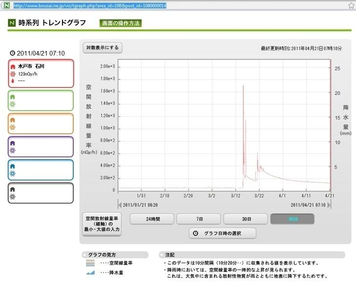 [Add: Now I see PietKuip has provided similar data. I would add that 3/21 and 4/9 it was raining in Mito, 4/10 it was not. 4/12 it was sunny in Mito, and wind was from the north. To know if the (possibly curving) wind path links up with Fukushima Daiichi one really needs the 2-dimensional AMEDASU plots for the region, but they only seem to go back 2 days.]