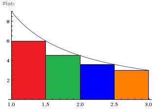 Find an approximation of the area of the region R under the graph of the function f on the interval [1, 3]. Use n = 4 subintervals. Choose the representative points to be the right endpoints of the subintervals.