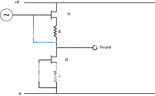 Hi, I'm trying to design a simple differential amp with extremely high input impedance. I'm using a couple of JFETs at the input stage to accomplish this. However, because I'm sending the signal from there to a differential amp, I don't want any DC offset, but I'm a little bit confused about how to bias J1, the first JFET. Basically my question is, should the blue wire be there. Even assuming I am dealing with two JFETs on the same silicon chip, and using the same value for both resistors, if I leave out that blue wire, I get a DC offset. But if I leave that blue wire in, I get almost no current through the bottom JFET and resistor, which is confusing to me. Any insight would be appreciated.