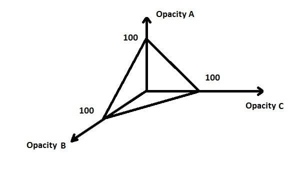 I am making a page control in HTML/CSS/JS *no wait - come back! I swear it's not about programming!* that allows the user to play with the opacities of three overlapping images (eg. imageA = opacity 60, imageB=39, imageC opacity=1 ). The final 3 values must always sum to 100 (i.e. you cannot have 33,33,0). This means the space for the user to play in is not a simple 3D cube with full freedom along all 3 axes (such as many RGB controls have).
