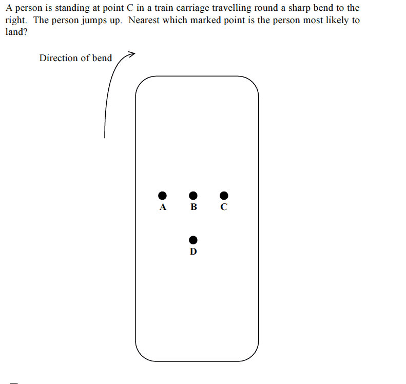 The discussion revolves around a physics problem involving a man jumping from a moving train as it makes a sharp turn. Participants explore concepts related to momentum, acceleration, and the effects of the train's speed on the man's trajectory. The problem touches on kinematics and dynamics, particularly in the context of circular motion.