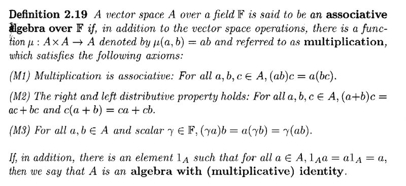 I have to say I do not find that this definition gives me a good intuitive idea of the nature of an algebra over a field ... ...I much prefer the definition given by Cooperstein in his book "Advanced Linear Algebra" (Second Edition) where he defines what he calls an "associative algebra over a field F" (which I take to be the same as D&F's k-algebra ... ... is that right?) ... ...Cooperstein's definition is as follows:
