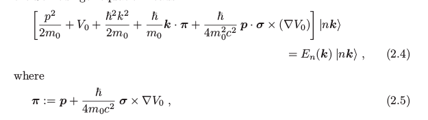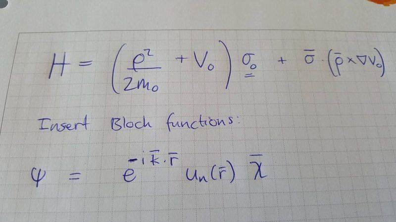 I am trying to derive the k dot p formula with the spin orbit interaction term included. I am having some trouble. I insert a bloch wave function multiplied with an unspecified spinor. But how do I treat the cross product term that comes from the SO and what is the effect of the pauli matrix vector on the spinor? And also: Since the spin orbit term contain the gradient of the coulomb potential how can I let p act on the bloch states? (I assume this how you derive the correct formula?)