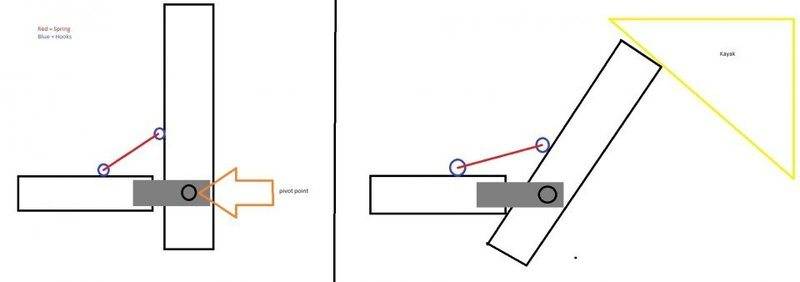 The discussion revolves around the design of a kayak loader, specifically focusing on the placement and specifications of a spring to assist in loading a kayak onto a vehicle. Participants explore various mechanical aspects, including spring force, arm positioning, and potential locking mechanisms.