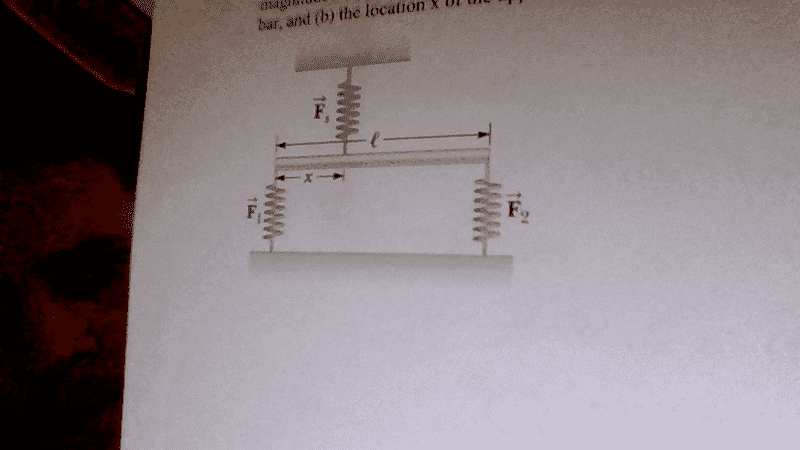 - A 2.35kg uniform bar of length 1.3m is held in a horizontal position by three vertical springs as in Figure P8.83. The two lower springs are compressed and exert upward forces on the bar of magnitude F1 = 6.80N and F2 = 9.50N, respectively. Find the force exerted by the top spring on the bar, and the location of the upper spring that will keep the bar in equilibrium.