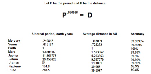 I am studying mathematical astronomy / the history of , and I have noted that by raising the average sidereal period of any planet in our solar system, to the power .666666, that you are left with the average distance of that planet from the Sun, in AU