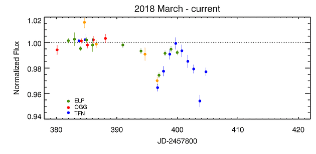 During January and February, the star is too close to the Sun for observations. Measurements resumed two weeks ago, and since March 16 the star shows another dip. Currently 4% below the baseline, the deepest dip seen since the end of Kepler observations.