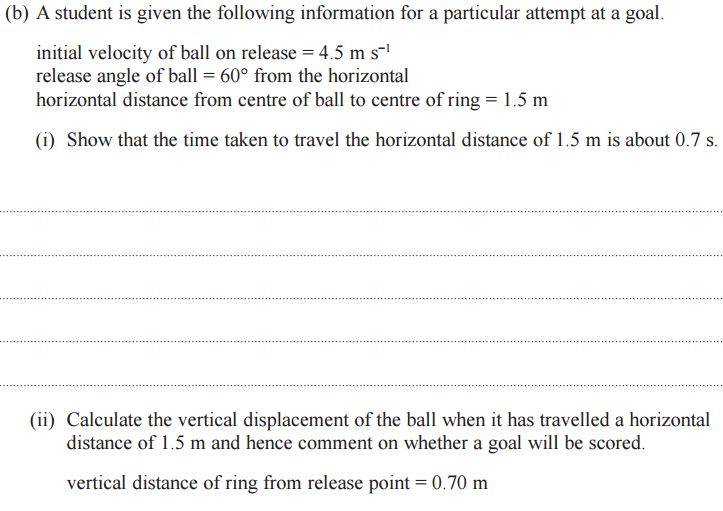 For (ii), since the horizontal time is 0.67 seconds this means the TOTAL time spent in air is also 0.67 seconds, so to calculate max height we split this time in half (since the ball has to go up to reach max height and then fall down again) and use the kinematic equations to find a value of S (distance)