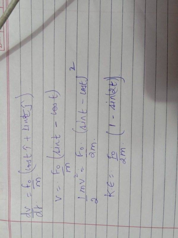 - a particle of mass m is subjected to a force F=F°(cos(t)i+sin(t)j) if initially the particle was at rest the kinetic energy of the particle as a function of time is fgiven by