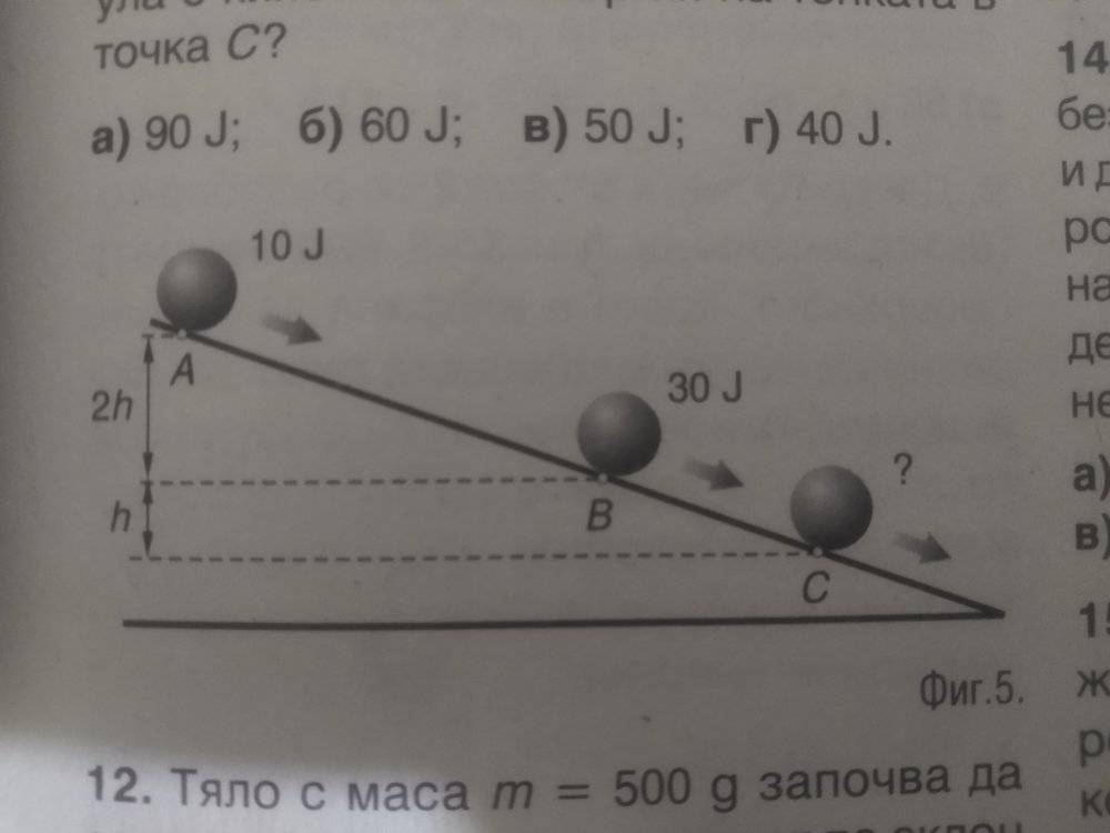 - Consider the situation in the attached photo. The kinetic energy in A is 10 J, in B is 30 J. What is the kinetic energy in C?