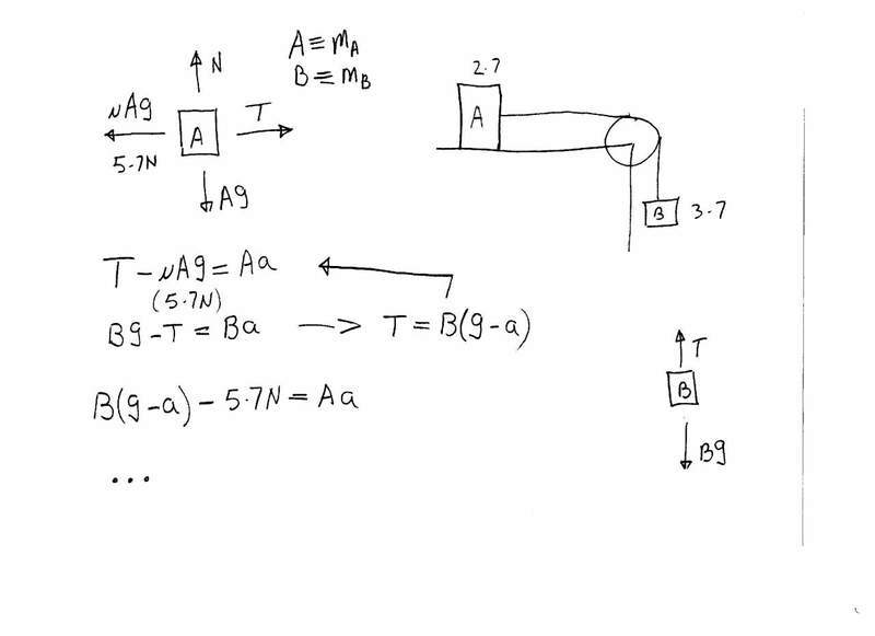 Block A and B are connected by a string passing over an essentially frictionless pulley. (Block A is on a horizontal plane, while block B is suspended in the air) When the blocks are moving block A experiences a force of kinetic friction of magnitude 5.7N. If mA= 2.7kg and mB= 3.7kg calculate the magnitude of: