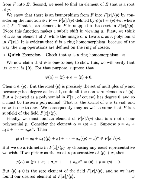 " ... ... We show that there is an isomorphism from ##F## into ##F[x] / <p>## by considering the function ##\psi \ : \ F \longrightarrow F[x] / <p>## defined by ##\psi (a) = <p> + a##, where ##a \in F##. ... ... "Te authors show that ##\psi## is one-to-one or injective but do not show that ##\psi## is onto or surjective ...