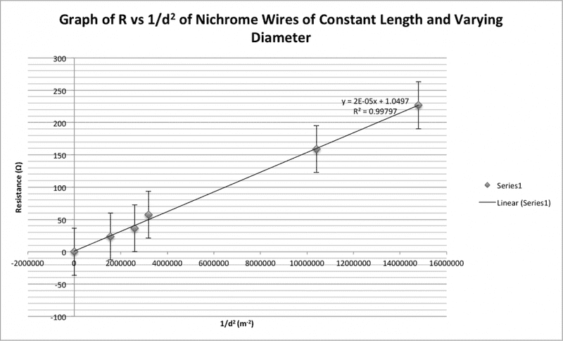 Length of wire: 10.00 ± 0.01 mWe are required to plot a graph of resistance, R (in Ohms) versus the inverse square of the diameter (in m^-2), i.e.; "R" vs. 1/d^2. We then have to calculate the slope of the graph, and from the slope determine the resistivity p of nichrome wire. We then compare our value of p with the published value of p = 1.18 x 10^-6 ohm*m.