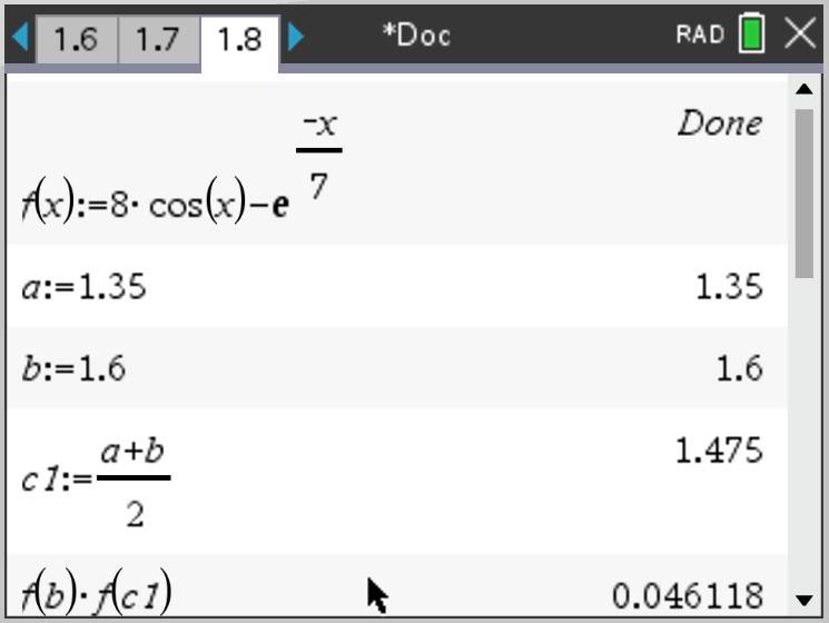 The Bisection Method is used to solve equations of the form $\displaystyle f\left( x \right) = 0 $, so we need to rewrite the equation as $\displaystyle 8\cos{ \left( x \right) } - \mathrm{e}^{-x/7} = 0 $. Thus $\displaystyle f\left( x \right) = 8\cos{ \left( x \right) } - \mathrm{e}^{-x/7} $.