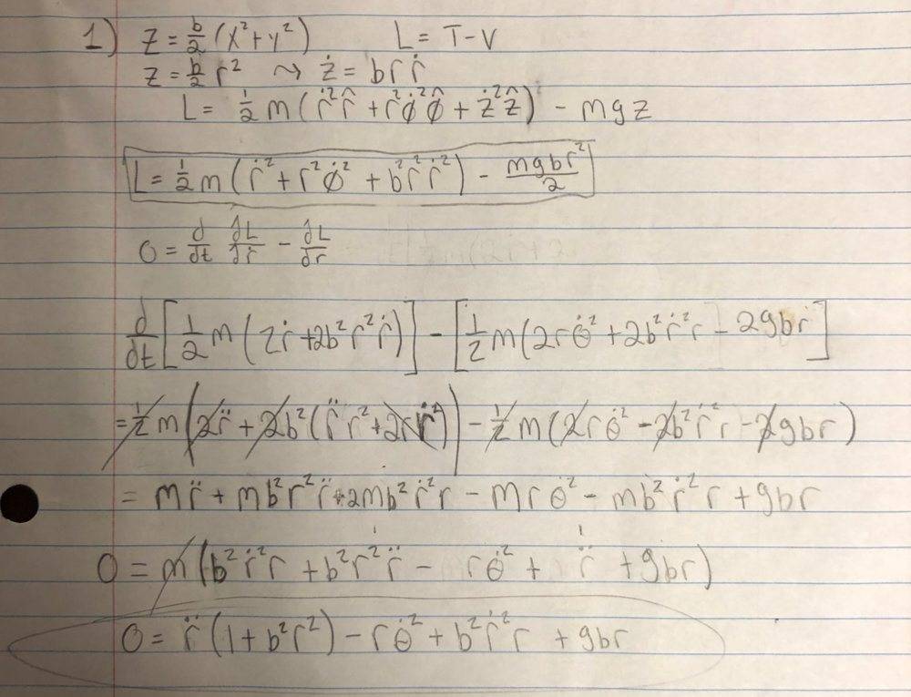 - A particle of mass m moves without friction on the inside wall of an axially symmetric vessel given by Z=(b/2)(x^2+y^2) where b is a constant and z is in the vertical direction. Find the Lagrangian of the system and the Euler-Lagrange equations. (Hint: work in cylindrical polar coordinates with x = r cos θ, y = r sin θ.)