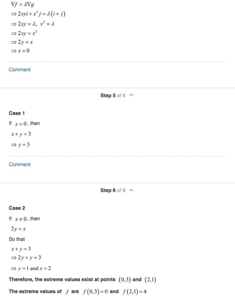 and proceed to use the "x+y=3" equation to give an alternative extrema which is f(0,3)