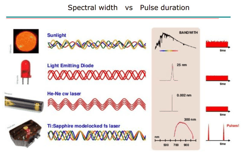 - One participant introduces the concept of coherence time and its relation to pulse duration, stating that a broad spectrum correlates with a short coherence time.