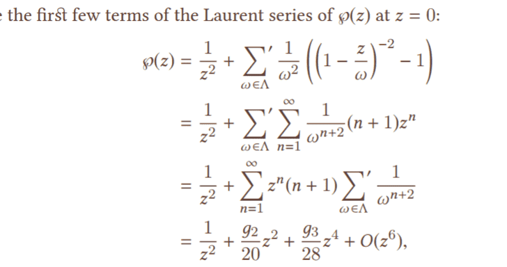 The discussion centers on the Laurent series expansion of the Weierstrass ℘ function, specifically the transition from the expression ##(1 - \frac{z}{w})^{-2}## to its series representation. Participants clarify that the correct expansion is given by the series ##(1 - t)^{-2} = \sum_{n=0}^{\infty} (n+1)t^n##, which can be derived from the binomial theorem and differentiation techniques. The conversation highlights the importance of accurately applying the binomial expansion and understanding the negative binomial coefficients in this context.