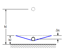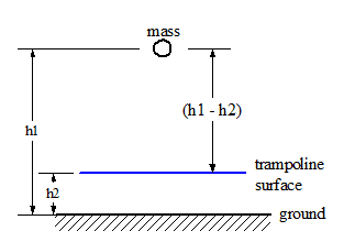 Now clearly, Harry falls a distance (h1 - h2) before hitting the trampoline. When the trampoline has maximally stretched the situation is as follows: