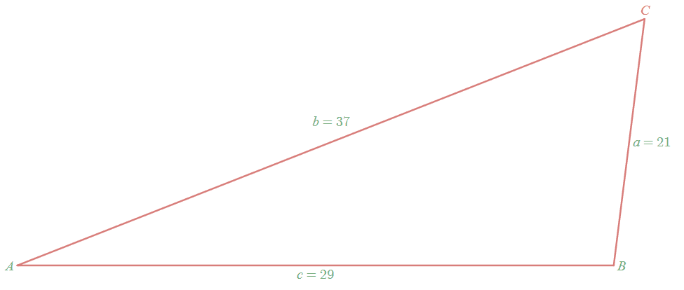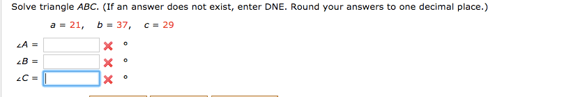 The discussion revolves around solving for the angles of a triangle given the lengths of its sides using the Law of Cosines. Participants explore the application of the formula and address issues related to the labeling of triangle sides and angles, as well as the interpretation of results.
