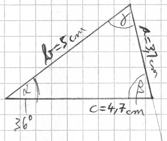 - The original poster attempts to apply the law of sines to find angles β and γ but encounters conflicting results from different approaches. Some participants question the feasibility of the triangle based on the provided dimensions, suggesting the use of the law of cosines instead.