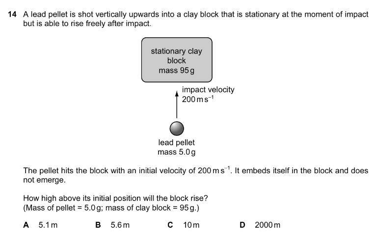The discussion revolves around a physics problem involving a lead pellet shot vertically into a clay block. Participants are exploring concepts related to momentum conservation and the motion of the block after the impact.