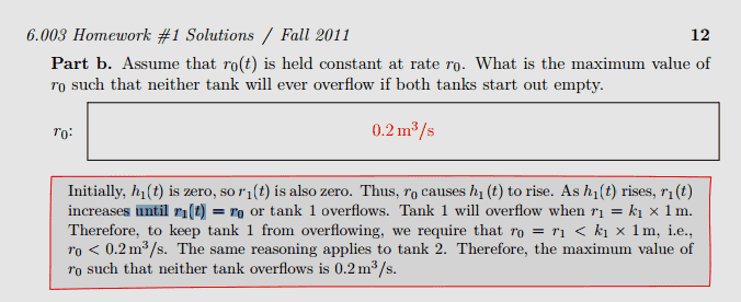 The discussion focuses on the leaky tank differential equation problem, specifically addressing the conditions under which a tank overflows. Participants emphasize the significance of the relationship between the inflow rate (r1) and the outflow rate (r0). When r1 equals r0, the system reaches a steady state, indicating that the water level will not rise further, thus preventing overflow. The maximum outflow rate of tank 1 must be equal to or greater than r0 to avoid spillage, highlighting the critical balance required for system stability.