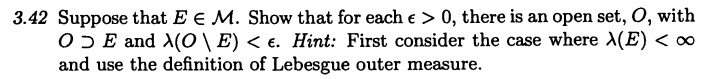 This discussion focuses on proving the existence of a specific open set in the context of Lebesgue measure, particularly addressing cases where the measure of set E is infinite. The participant successfully solved the finite case but seeks guidance on handling infinite measures. A proposed solution involves analyzing intersections of intervals with E, utilizing sufficiently small epsilon values to sum and recover the original epsilon.